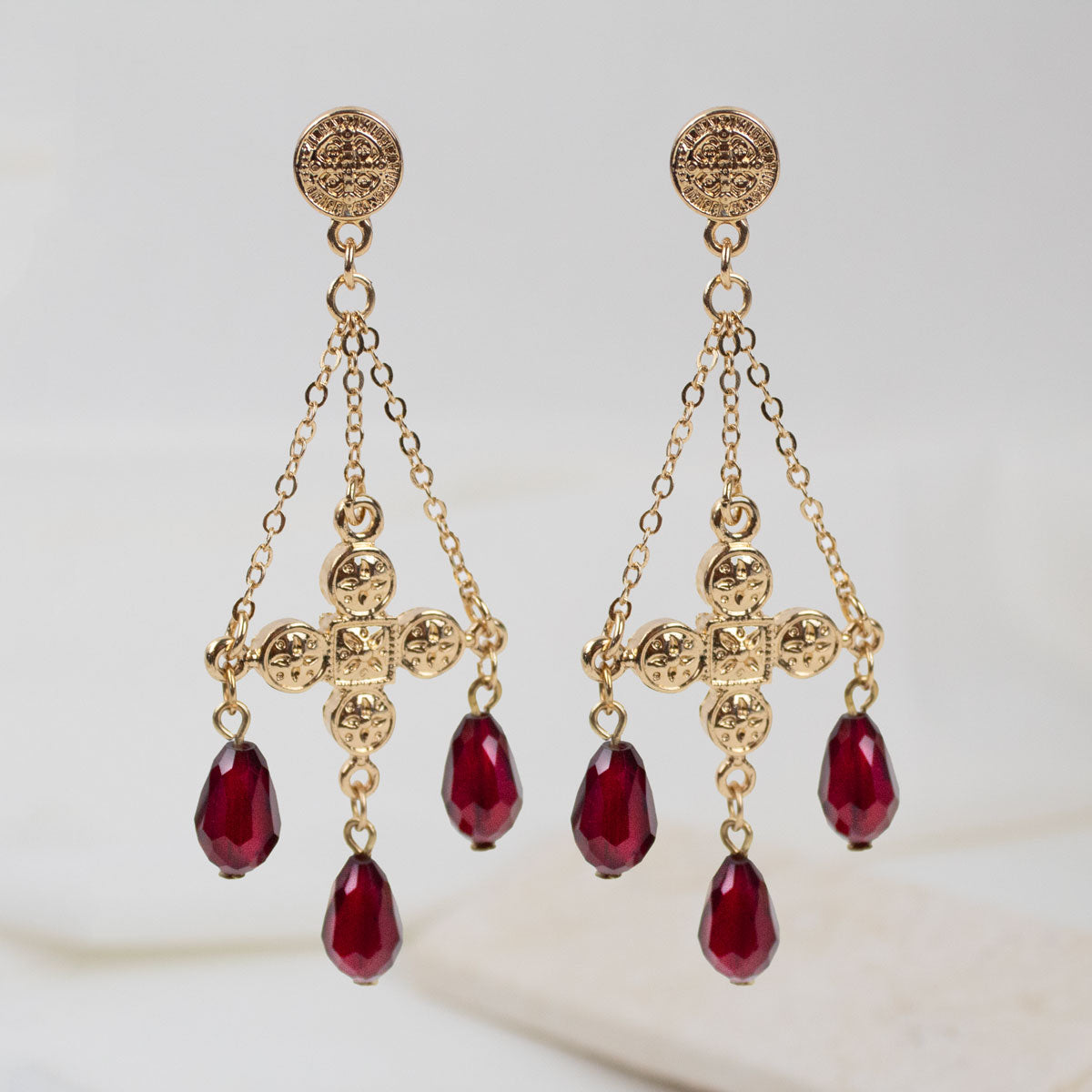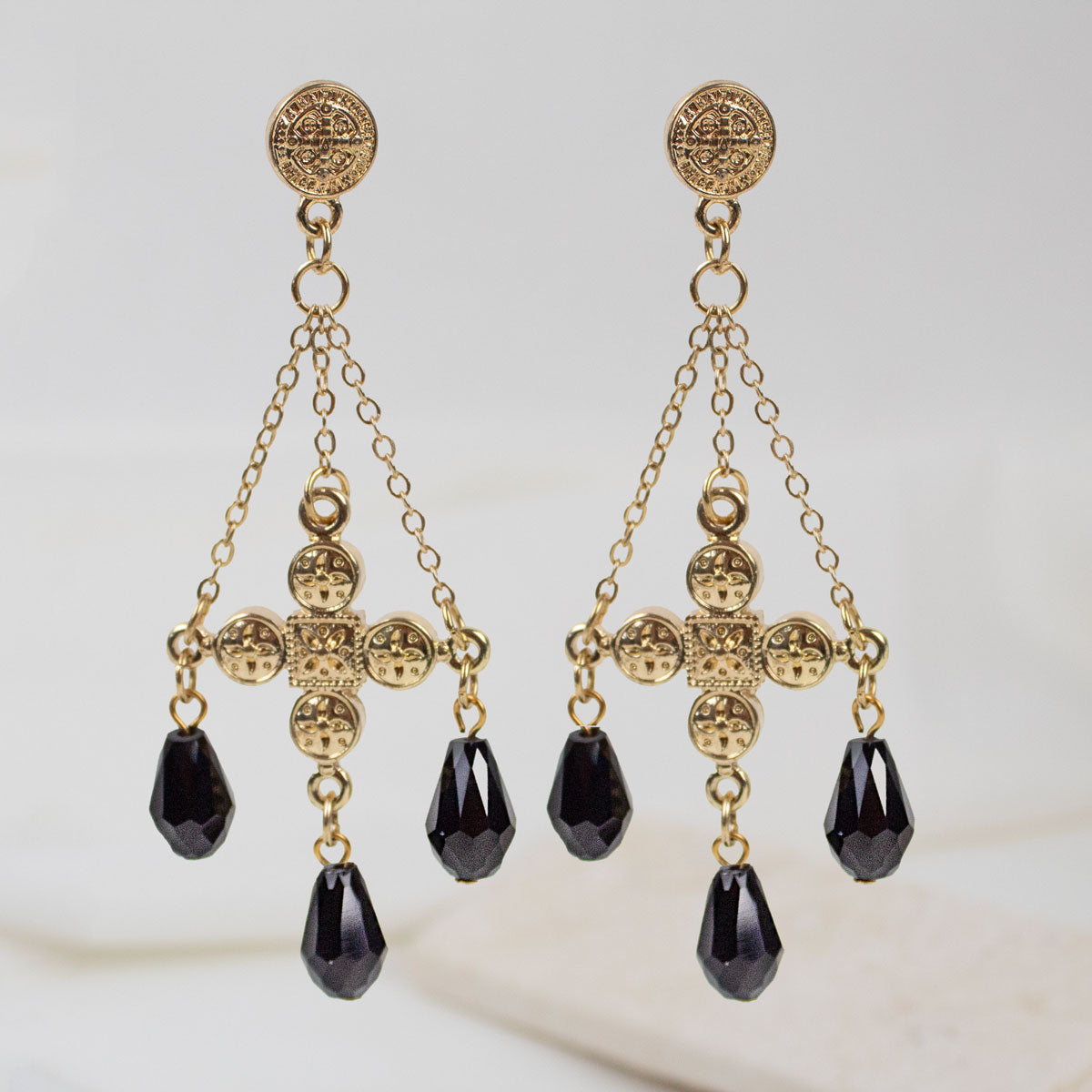 The Benedictine cross of protection is at the foundation of your cross Chandelier Earrings.