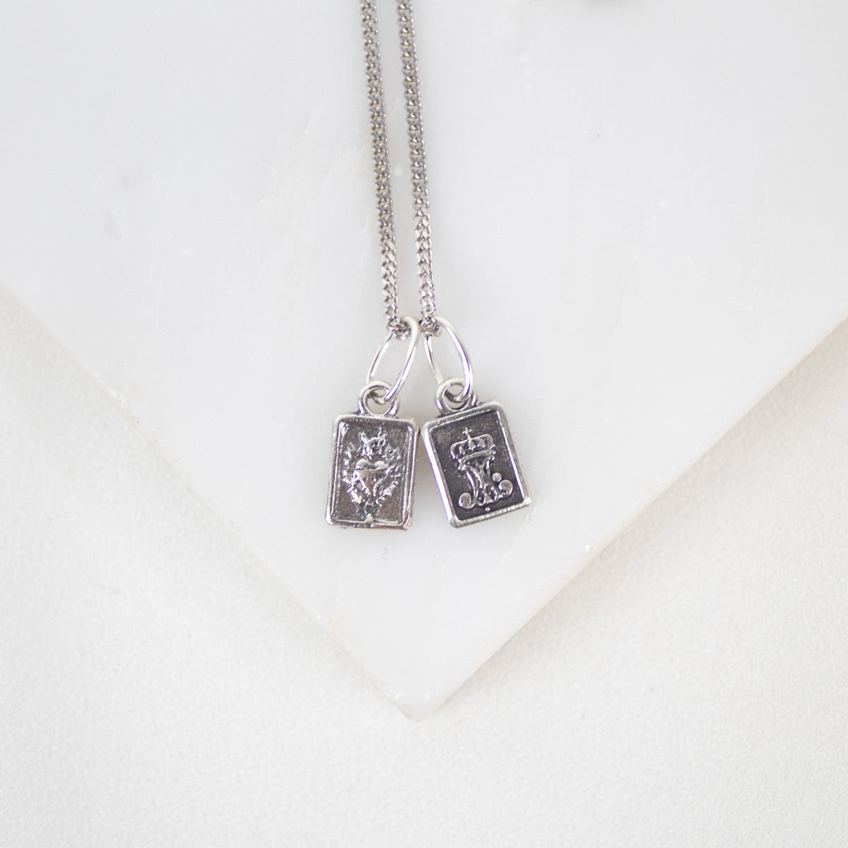 - Two 1 cm sterling silver rectangle scapular Sacred Heart of Jesus and our Blessed Mother Mary's/monogram the Auspice Maria medals