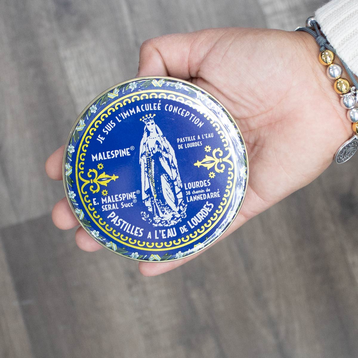 Our Pastilles a L'eau de Lourdes (Holy Water Candies from Lourdes) are infused with holy water from the sacred grotto. The candy received the blessing of Pope Leo XIII on January 26, 1888. The tin still bears the original design, including an image of Our Lady of Lourdes and the words given to St. Bernadette, "Je suis l’Immaculée Conception."