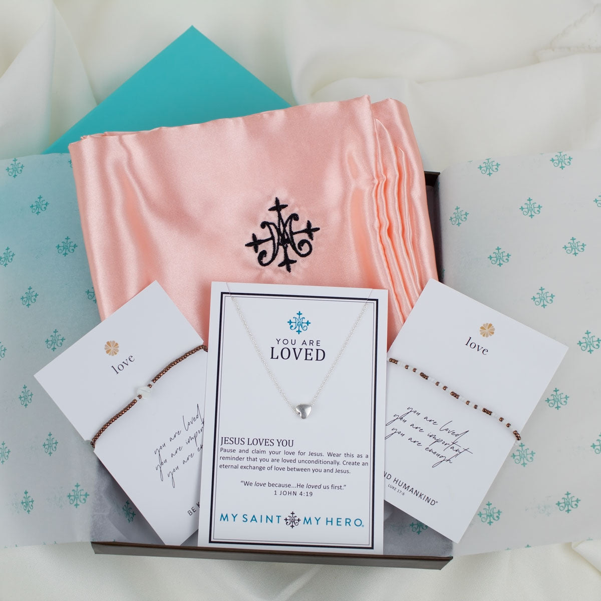 Our February You Are Loved Bundle includes $84 in curated faith-based jewelry and home décor, and begins shipping February 3rd. The February bundle pairs a Jesus Loves You Necklace (available in gold or silver floating heart) with two Be Kind Humankind Love Bracelets—one hand-beaded with a mother of pearl heart, the other hand-beaded with "love" in Morse code. The bundle also contains a premium pink satin Guardian Angel Pillowcase embroidered with the traditional Guardian Angel prayer.