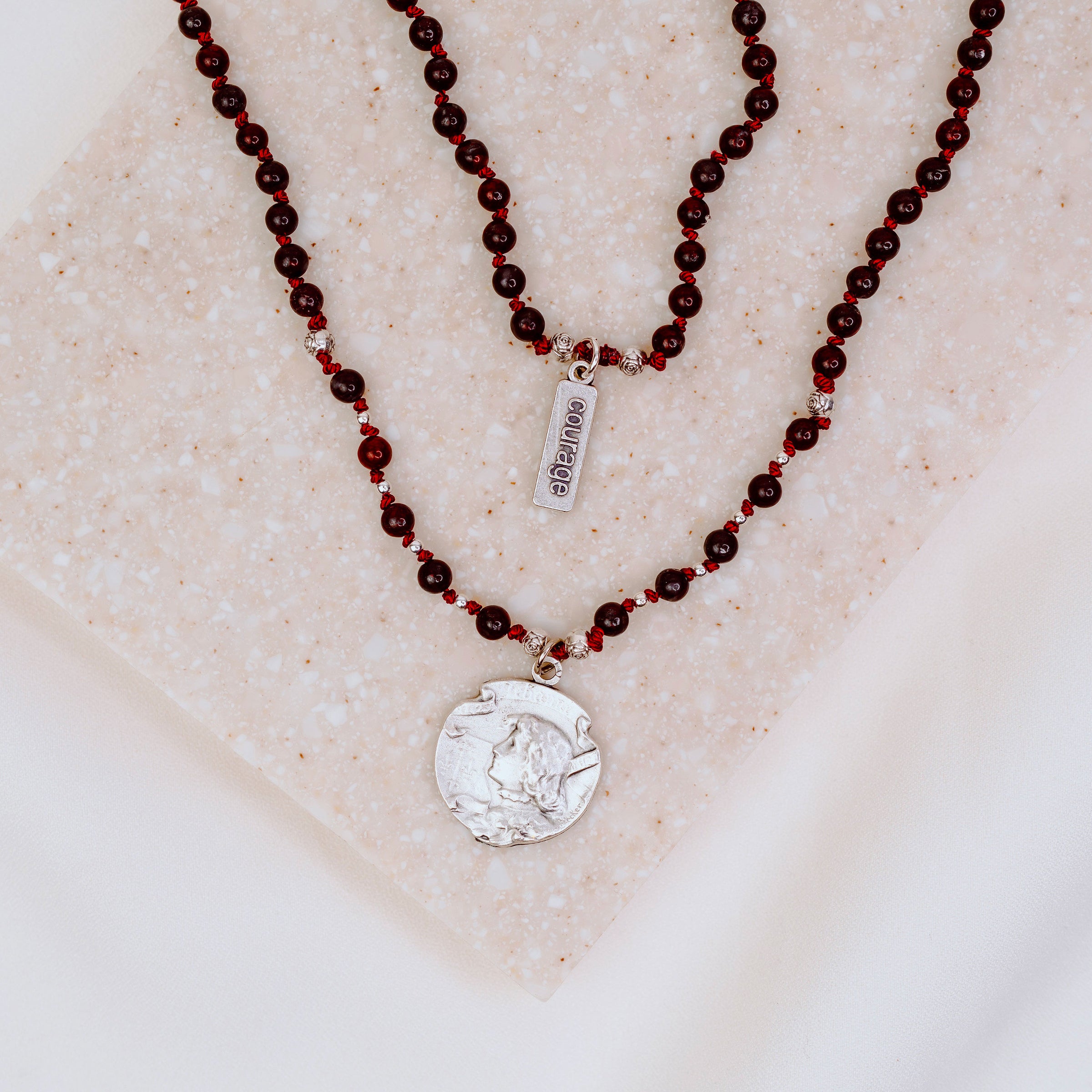 - Red jasper gemstones and silver or gold-tone beads on hand-tied red silk thread
