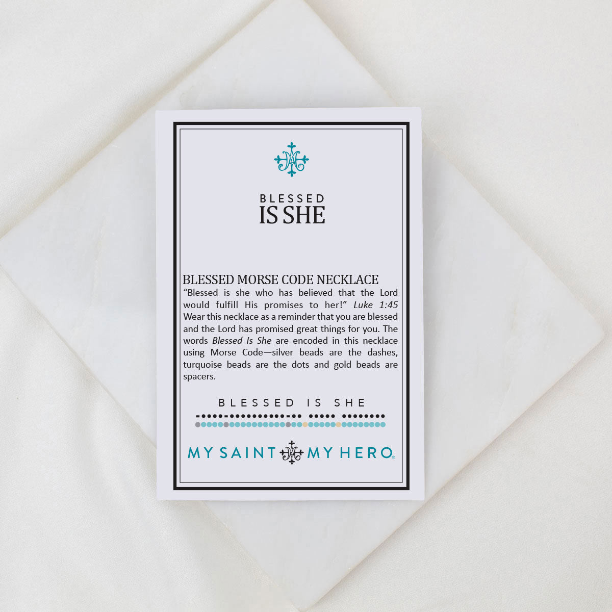 Wear this necklace as a reminder that you are blessed, and the Lord has promised great things for you. The words "blessed is she" are encoded in this necklace using Morse code—silver beads are the dashes, turquoise beads are the dots, and gold beads are spacers.