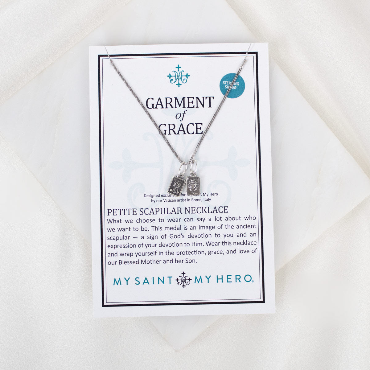 - This Garment of Grace Petite Scapular Necklace is on a sterling silver 18" chain