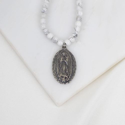 A pearl necklace with a silver-tone toggle and a gold-plated Our Lady of Guadalupe medal with hand-laid crystals, displayed on a white surface.