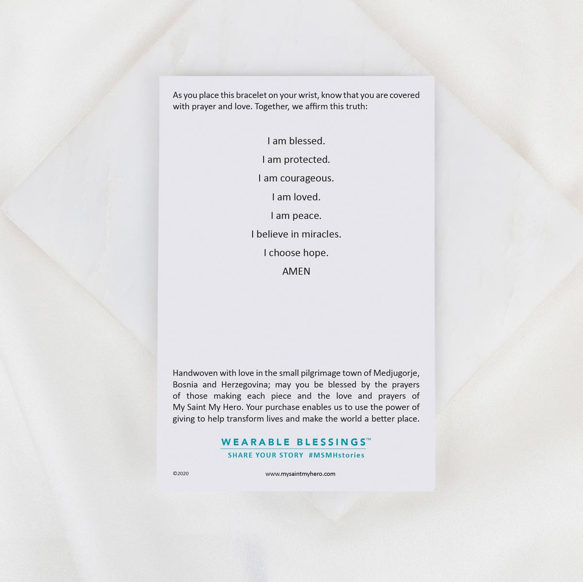 Wear this bracelet as a reminder that God wants to bless you abundantly and protect you always. May hope flood your heart and may the blessings of today be a step along the way to great graces.